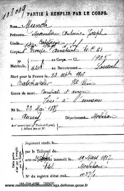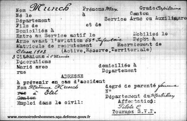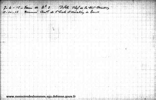 Né le: 23 mai 1895Mort le: 23 septembre 1916 Profession avant la mobilisation: Officier Passé à l'aviation le: 1913 Pilote Brevet militaire le: Parcours: BL 3, C 61 Affectations: Pilote