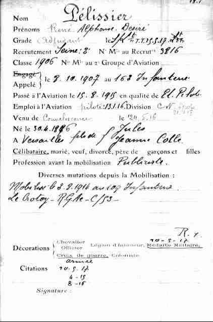 * Chevalier de la Légion d'honneur et citation n° 10.218 à l'ordre de l'armée du Slt René Désiré Pélissier, au 109e régiment d'infanterie, pilote à l'escadrille SPA 155, en date du 29 septembre 1918 : "Officier de haute valeur, qui s'est distingué par une habileté et un courage incomparables. Après avoir rendu des services exceptionnels dans l'aviation de réglage, donne dans l'aviation de chasse de nouvelles preuves de ses hautes qualités morales, auxquelles il doit un prestige mérité et l'admiration de ses subordonnés. A abattu cinq avions ennemis et exécuté de nombreuses missions de mitraillages et de reconnaissance en monoplace. Le 12 et le 13 septembre 1918, affrontant à basse altitude le feu de l'ennemi et dans des conditions atmosphériques défavorables, a rapporté des renseignements extrêmement précis et du plus haut intérêt pour le commandement. Deux blessures. Médaillé militaire pour faits de guerre. Cinq citations."