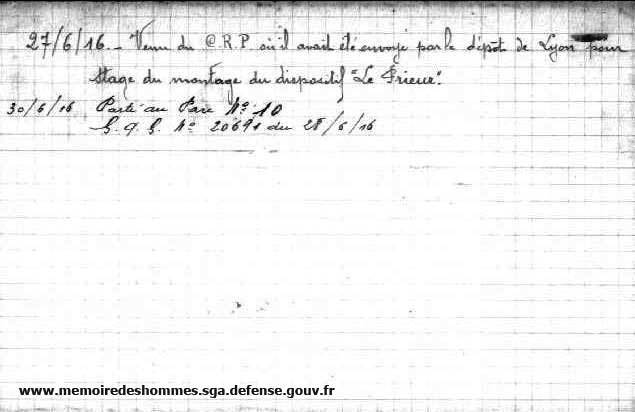 Mécanicien Renault 130 et Stage "Le Prieur" 27 juin 1916 : Venu du CRP où il avait été envoyé par le dépôt de Lyon pour stage de montage du dispositif "Le Prieur".