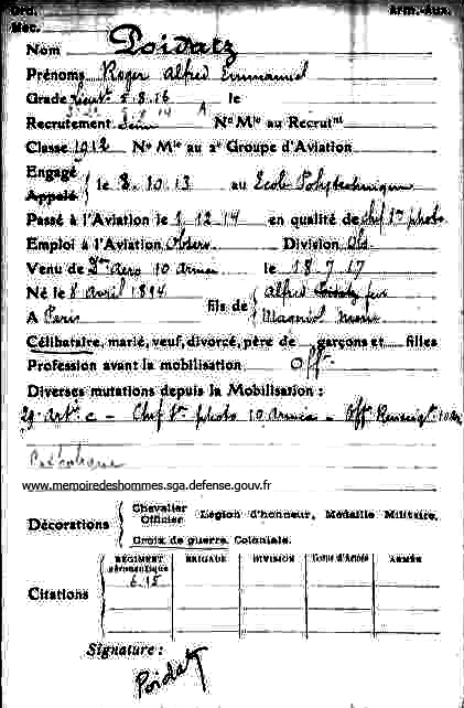 Né le: 8 avril 1894 Mort le: Profession avant la mobilisation: Officier Passé à l'aviation le: 1 décembre 1914 Chef Service photo Brevet militaire le: Parcours: 2^ème Artillerie. Chef Service Photo 10ème Armée. Officier renseignement 10ème Armée Etat Major du GAC le 30/8/17 Affectations: Observateur