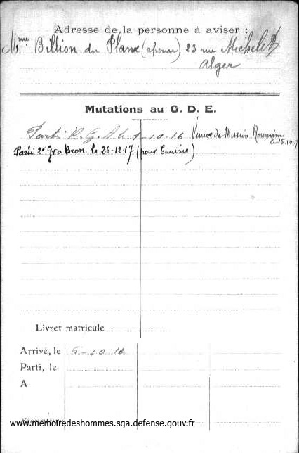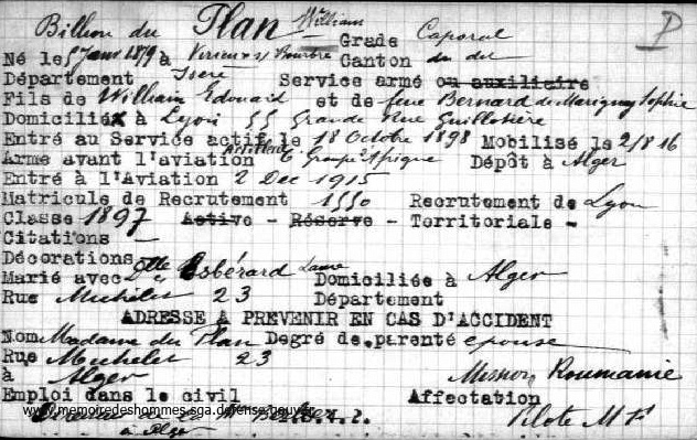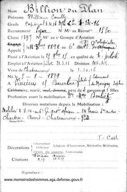 BILLON DU PLAN (William), maréchal des logis d'artillerie détaché dans l'aviation militaire en Roumanie : sous-officier d'une énergie et d'une bravoure à toute épreuve. Au cours de la bataille des 27, 28 et 29 novembre 1916 est allé chercher des renseignements précieux à 100 kilomètres dans l'intérieur des lignes et à 200 mètres d'altitude, ramenant chaque fois son avion percé de balles. Le 5 mai, au cours d'une reconnaissance lointaine et son avion de protection ayant une panne, n'a pas hésité à continuer seul sa mission et n'est rentré qu'après l'avoir remplie entièrement, malgré les attaques d'un appareil de chasse ennemi, ayant eu au cours du combat son avion crib10 àl,, balles (Croix de guerre). Paris, le 24 juillet 1917 |